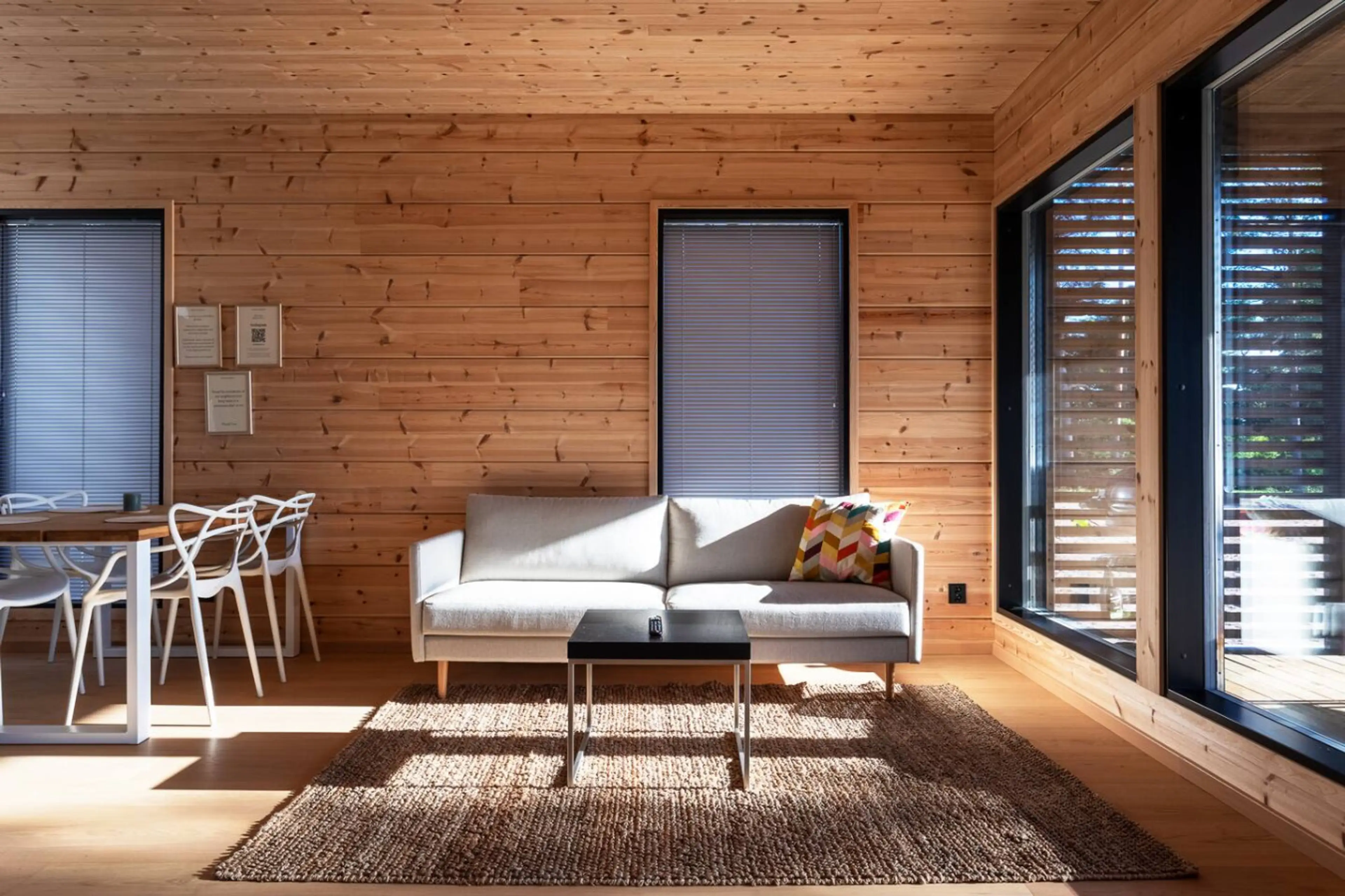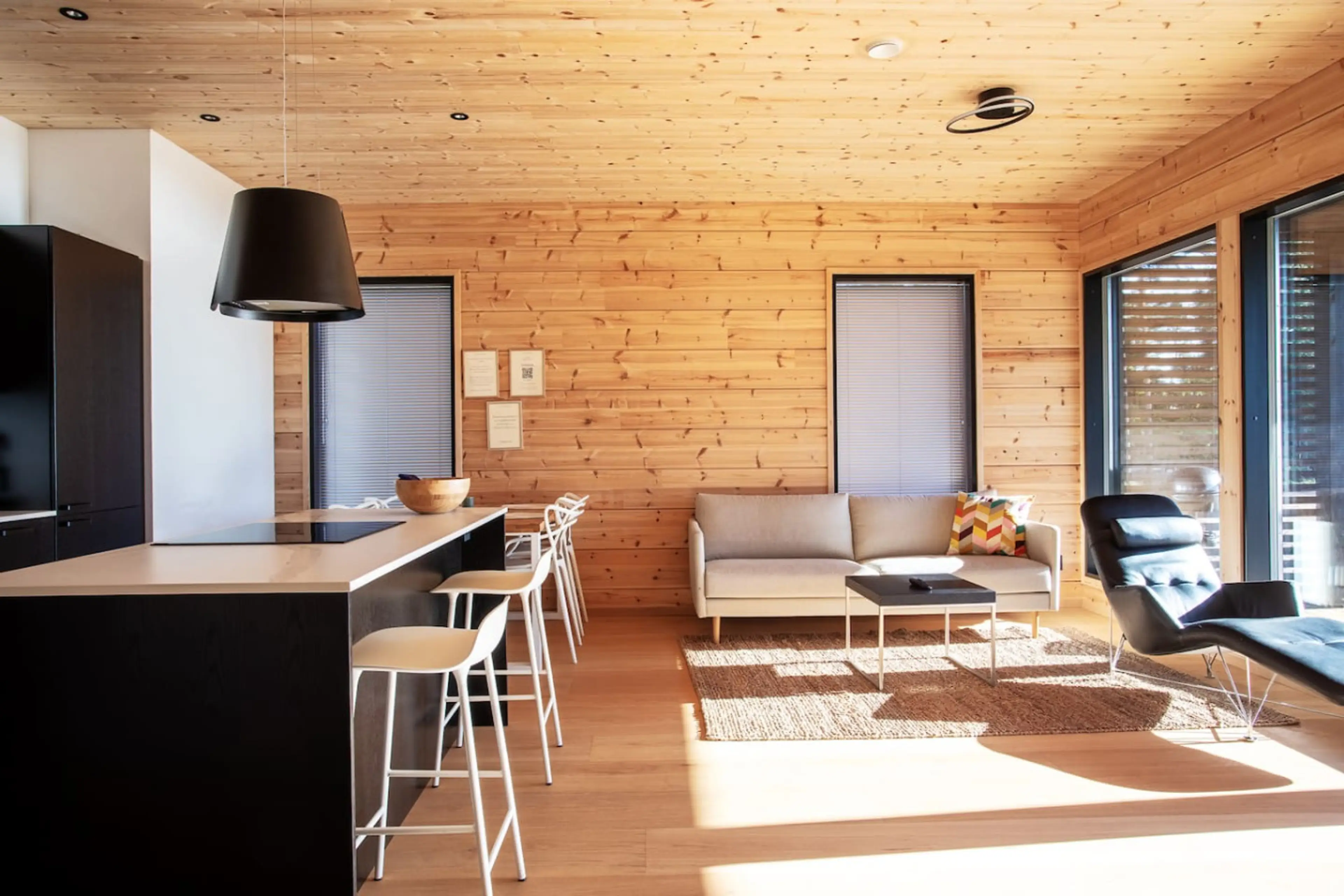 Saunamäki C is a modern 2-bedroom stay set on the sandy shore of Särkisalo. Completed in 2023, it features a bright living area with a fireplace, a fully equipped kitchen, and two bathrooms. Large windows open to a covered terrace with sea views and an electric BBQ. Guests can enjoy the cave sauna, ...